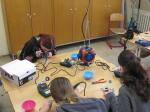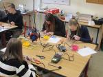 Die Schüler der 9. Klasse arbeiten an der Herstellung von einem Dämmerungsschalter. Als erstes haben sie eine Technische Zeichnung erarbeitet, danach auf ein Holzbretchen übertragen. Nächster Schritt war die elektrischen Bauelemente auflöten und die Funktion der elektrischen Schaltung zu prüfen.