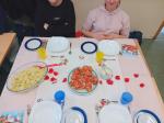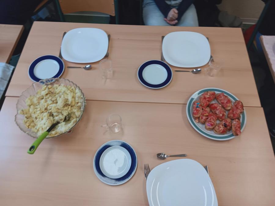 Die Schülerinnen und Schüler haben ein Drei-Gänge-Menü vorbereitet. Vorspeise war Italien "Bruschetta", Hauptgang Thailändisches "Pad Thai" und anschließend Nachtisch Französische "Moelleux au Chocolat"