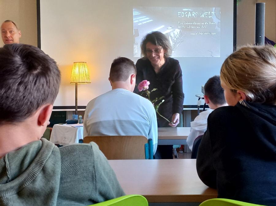 Am 5.11.24 waren Frau Malu Sieber und Herr Michael Oertel zu Gast bei unserer Lebens(f)Fest-Initiative. Diese Stunden begannen mit einem Musikstück, komponiert von einem 12jährigen Jungen aus Tschechien. Dann wurden von Frau Siebert und Herrn Oertel Antworten auf die Fragen "Was ist Flück" vorgelesen. Berufsschüler wurden diese Frage und auch die kommenden gestellt. Viele Antworten waren sehr bewegend. Auch die Antworten auf die Fragen "Was ist Armut?", "Was ist Reichtum?", "Was macht dich glücklich?", "Was oder wer ist verrückt?" und "Was ist Liebe?" waren beeindruckend und regten zum eigenen Nachdenken an. Unterbrochen wurde die Lesung mit Eindrücken für alle Sinne. Wir durften an einer Rose riechen, ein Stück Schokolade genießen, uns an Seifenblasen erfreuen, eine Umarmung erleben und ein wieteres tolles Musikstück hören.