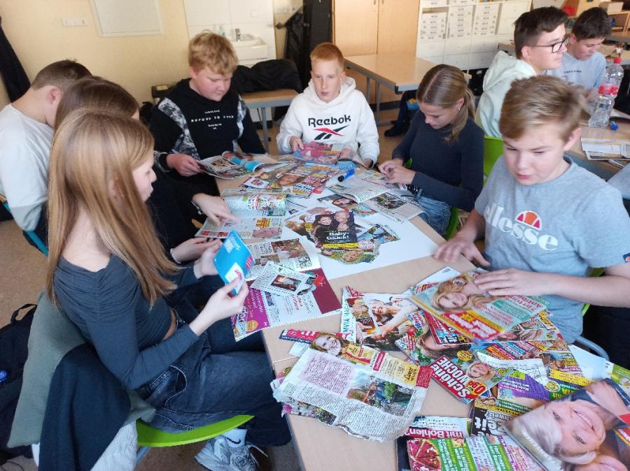 Im den letzten beiden Stunden wurden in vier Gruppen Collagen zum den Themen "Liebe", "Unglück", "Armut" und "Reichtum" erstellt. Die Teilnehmerinnen und Teilnehmer der 7. und 8. Klassen suchten aus vielen Zeitschriften die passenden Bilder für sich heraus. Es wurde geschnippelt, gerissen, aufgeklebt und heraus kamen sehr gute Collagen. Diese wurden dann dargestellt.