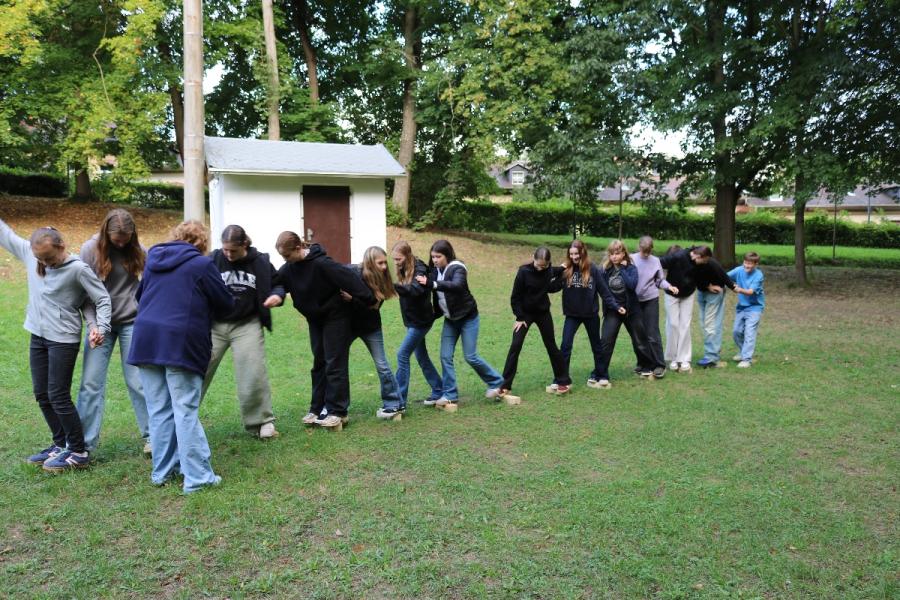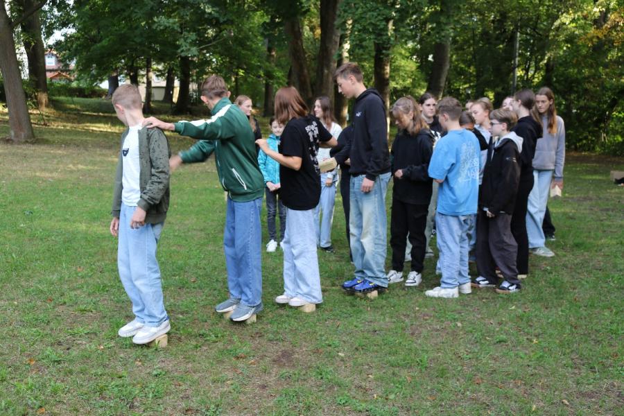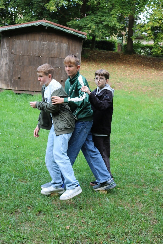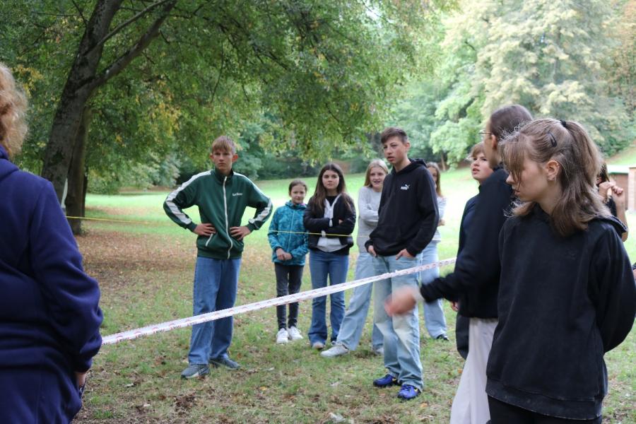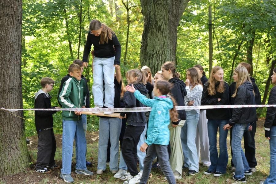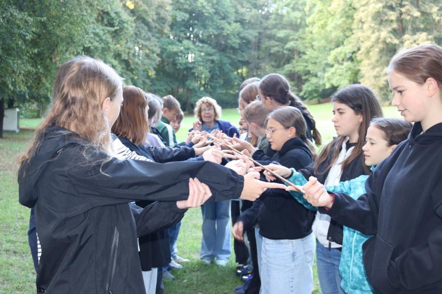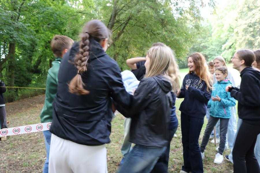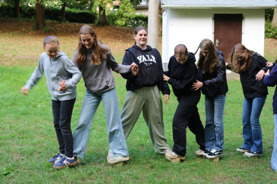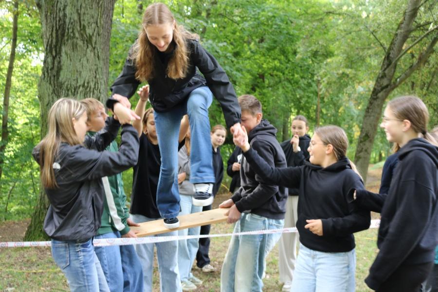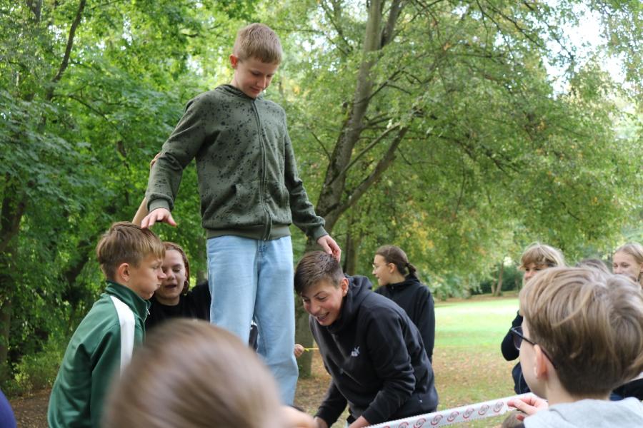 ... unter diesem Thema haben wir unseren dritten Durchgang mit den Teilnehmer der 7. Klassen an der Lebens(f)Festinitiative eröffnet. Bei verschiedenen Aktionen mussten die Teilnehmerinnen und Teilnehmer ihren Teamgeist beweisen. Als Gruppe mussten sie auf Holzklötzchen einen imaginären Sumpf überqueren. Die Herausforderung bestand darin, dass weniger Holzklötze als Teilnehmerinnen und Teilnehmer zur Verfügung standen. Später mussten sie eine Mauer überwinden und hatten nur ihre Muskelkraft und ein Holzbrett zur Verfügung. Aber sie haben alle Herausforderungen sehr gut gemeistert. Wir hatten viel Freude dabei.