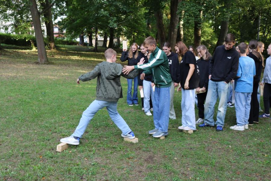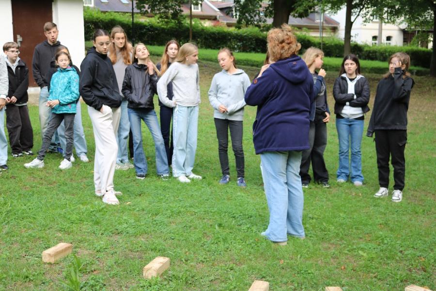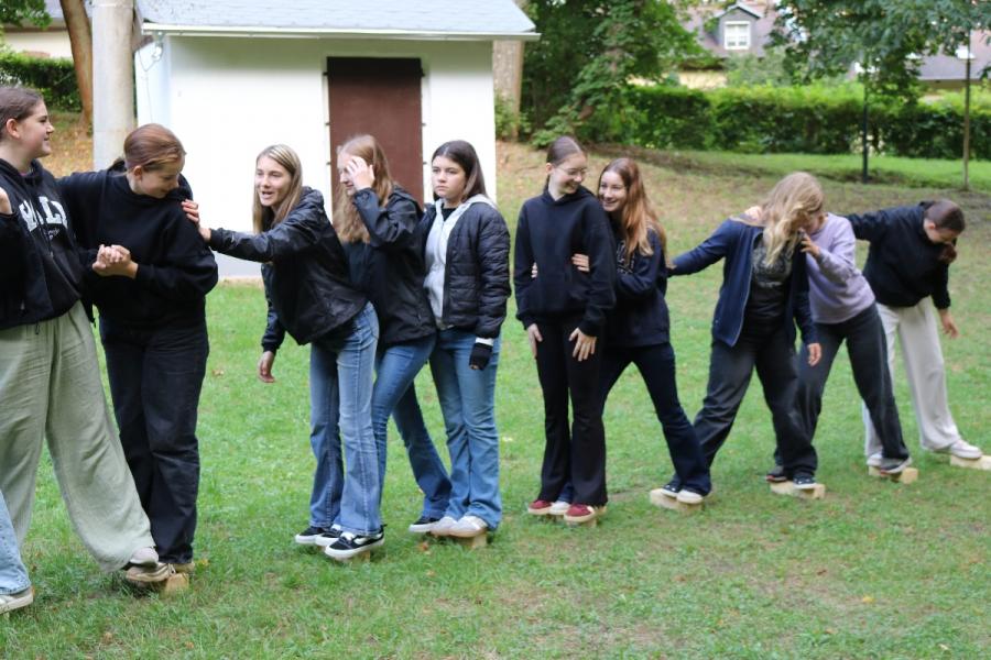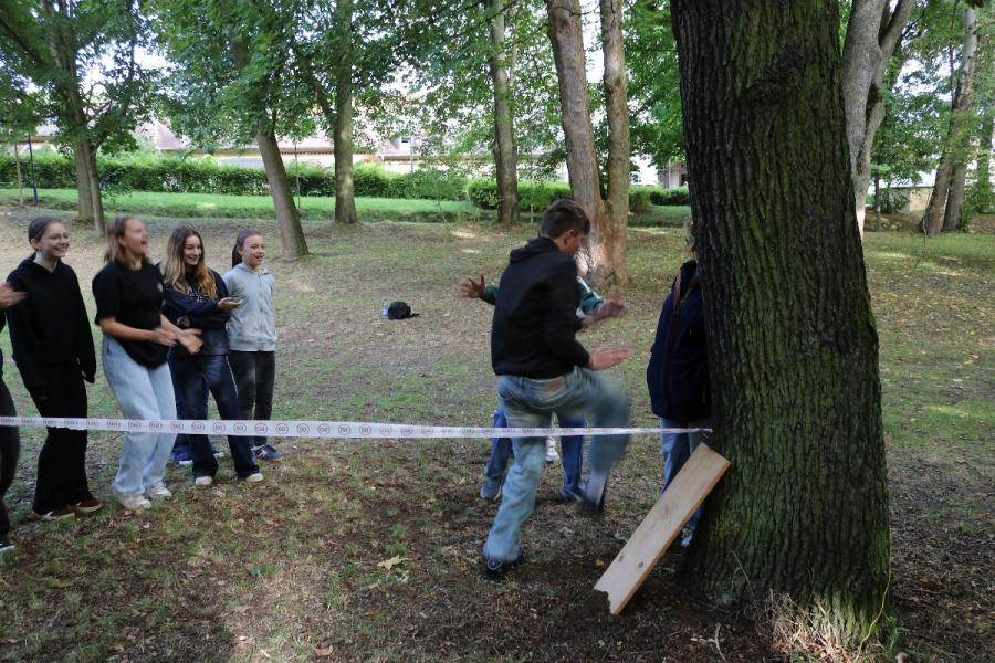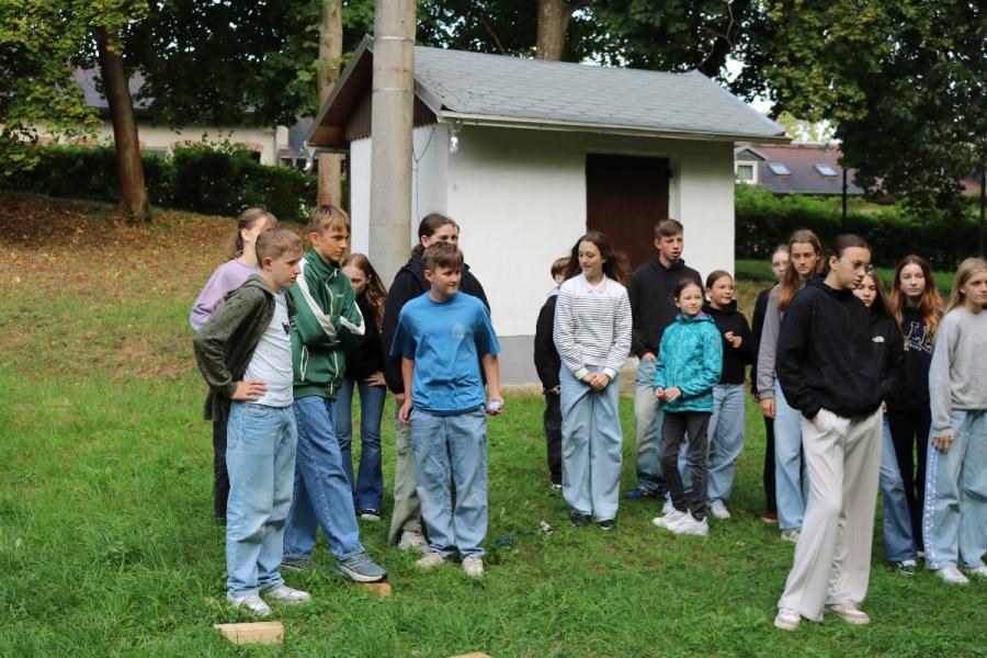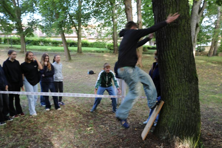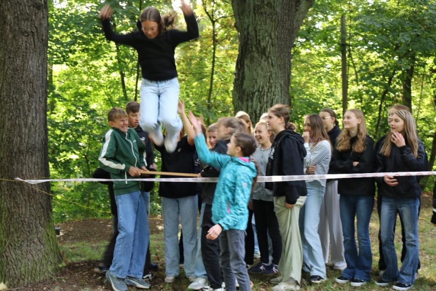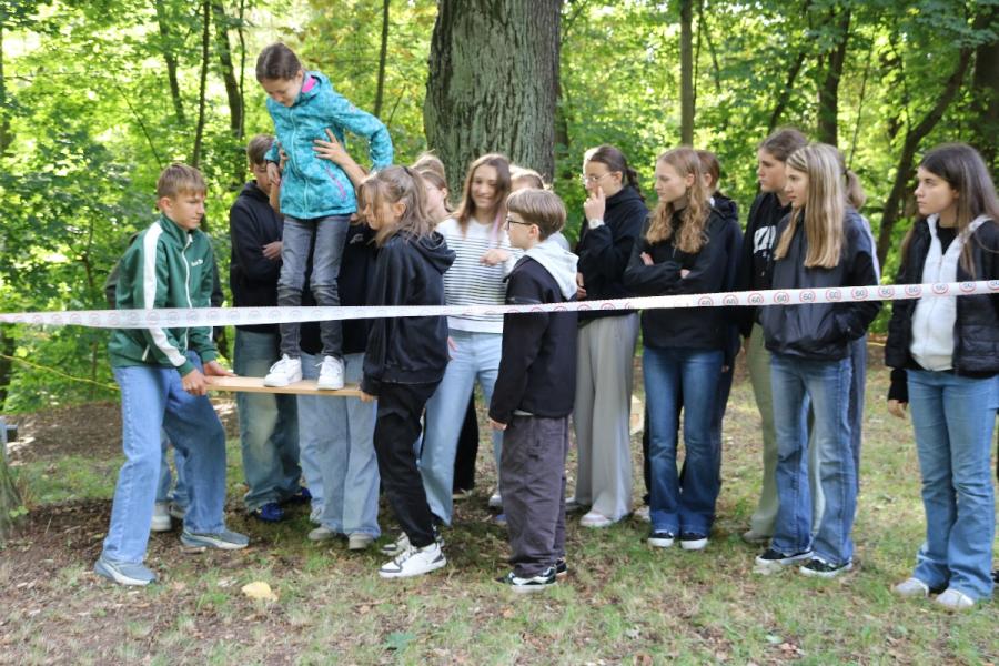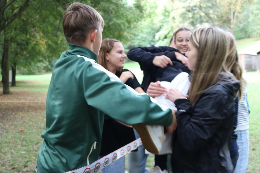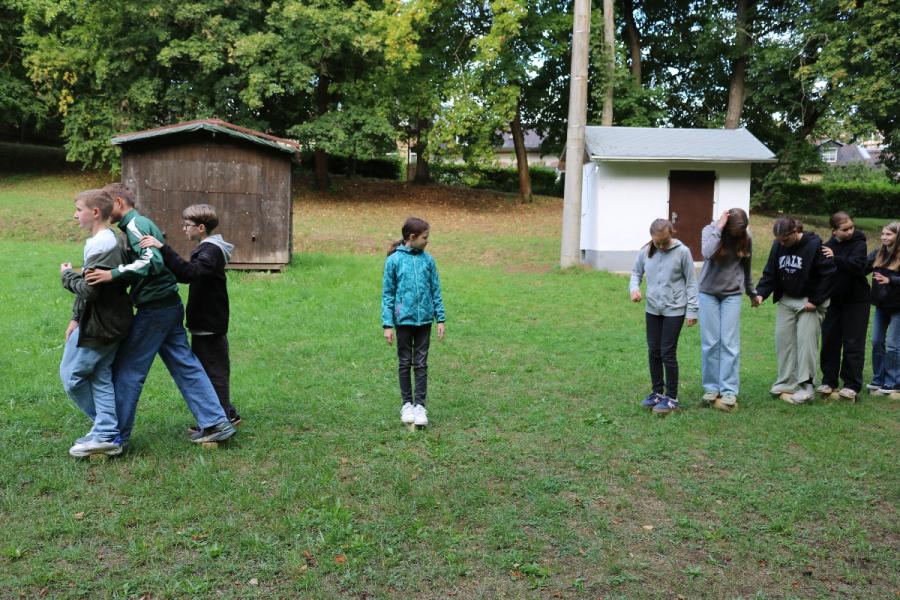 ... unter diesem Thema haben wir unseren dritten Durchgang mit den Teilnehmer der 7. Klassen an der Lebens(f)Festinitiative eröffnet. Bei verschiedenen Aktionen mussten die Teilnehmerinnen und Teilnehmer ihren Teamgeist beweisen. Als Gruppe mussten sie auf Holzklötzchen einen imaginären Sumpf überqueren. Die Herausforderung bestand darin, dass weniger Holzklötze als Teilnehmerinnen und Teilnehmer zur Verfügung standen. Später mussten sie eine Mauer überwinden und hatten nur ihre Muskelkraft und ein Holzbrett zur Verfügung. Aber sie haben alle Herausforderungen sehr gut gemeistert. Wir hatten viel Freude dabei.
